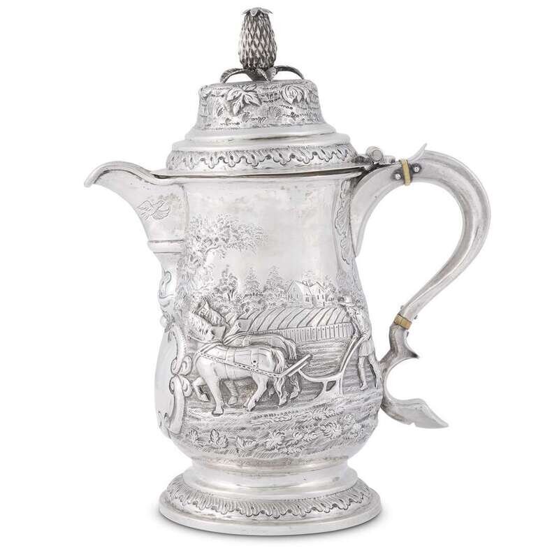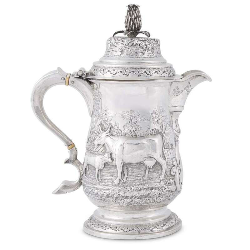Finely repoussé decorated with pastoral farm scenes surmounted by pineapple finial; marked to underside.