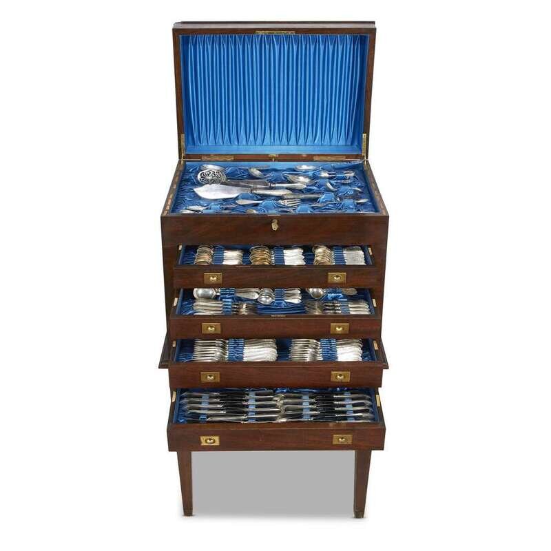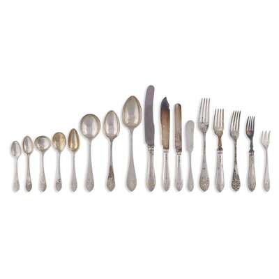 Comprising twelve each butter knives, oyster forks, fruit knives, tea spoons, citrus spoons, ice cream spoons, table spoons, soups spoons, fruit forks, coffee spoons, dessert spoons, bouillon spoons, fish knives, table forks, fish forks, dessert forks, table knives, and dessert knives; two preserve spoons, a salad spoon and fork, a cake fork and knife, serving ladle and fork, small cream ladle, sugar tongs, small cream ladle, sugar sifter, small cake slice, a master butter knife, a small cake serving knife, a butter fork and a pick. (approx. 233).