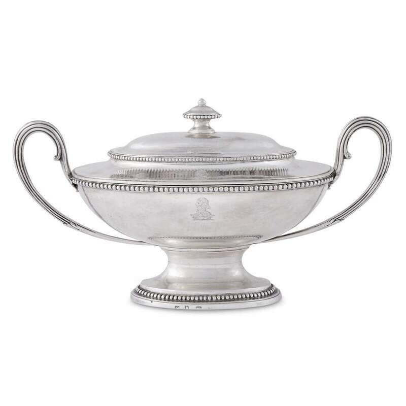 Of plain oval shape, long threaded scroll handles, the cover with vase shaped finial, engraved two crests, the body plain with beaded edge and engraved arms and a crest, all on conforming oval foot.