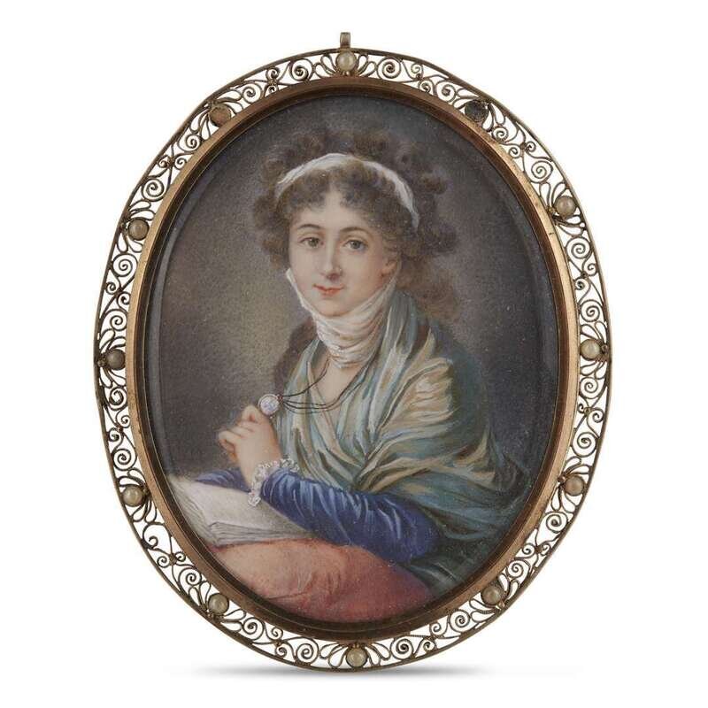 Watercolor on ivory, depicting a lady reading letters in blue shawl; in original pearl-set giltmetal filigree frame , the verso mounted with tortoiseshell and giltmetal monogram possibly "ELND."