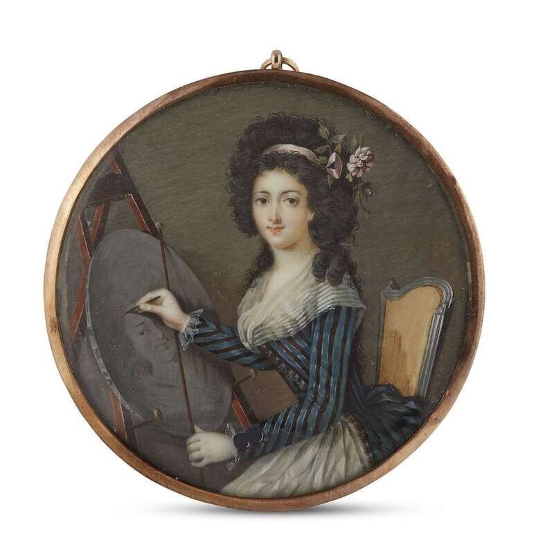 Watercolor on ivory, depicting a young lady in striped dress painting a self portrait; housed in a later giltmetal frame with vacant reserve to verso.
