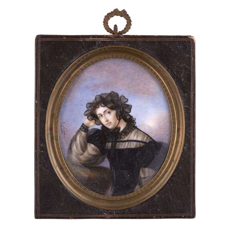 A portrait miniature of woman in mourning dress signed c. Fridon née Sattler, second quarter 19th century