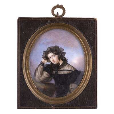 Watercolor on ivory, depicting a lady in mourning dress and bonnet; housed in engine-turned giltmetal-mounted tooled leather frame.