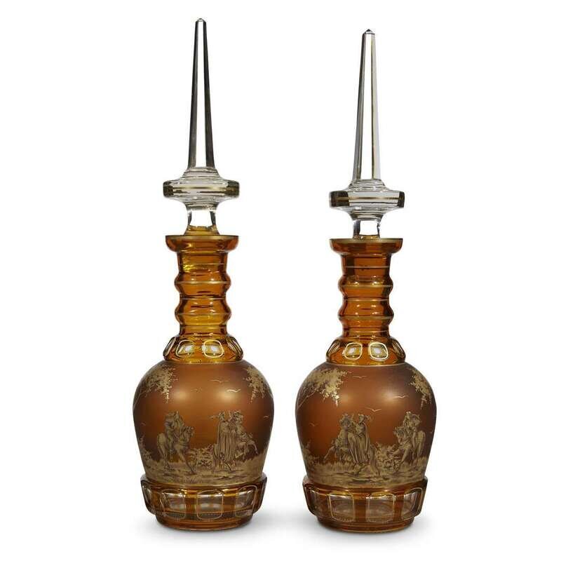 A pair of Bohemian parcel-gilt amber glass decanters Wolfgang Berndt, early 20th century