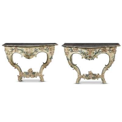 A pair of South German Rococo cream and polychrome painted consoles 18th century