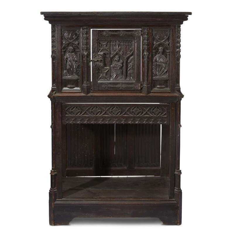 A Flemish late Gothic iron-mounted carved oak court cupboard 16th/17th century