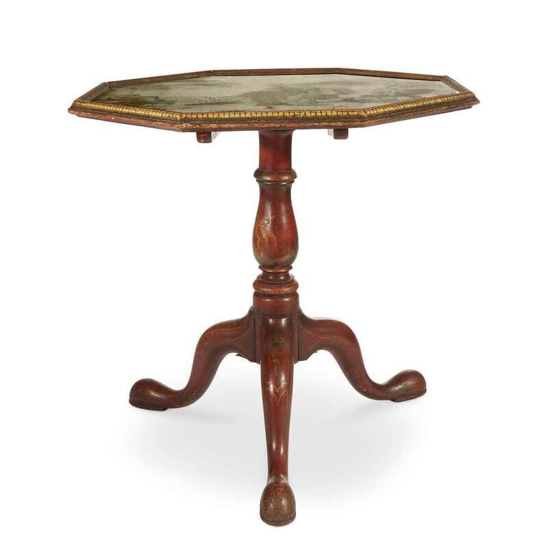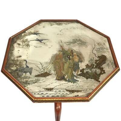 A George III style red lacquered tilt-top tea table with verre églomisé top in the Chinese taste late 19th century