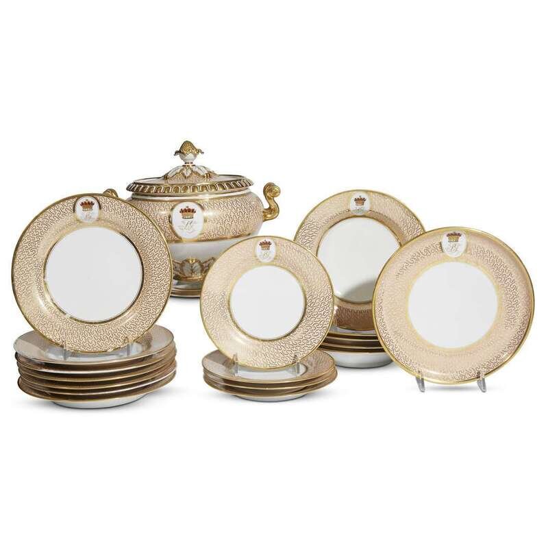Each with a reserve painted with initials "SG" surmounted by a ducal crown, comprising thirteen dinner plates, six soup plates, four dessert plates, and a covered soup tureen; each with impressed and printed circular marks to underside. (25).