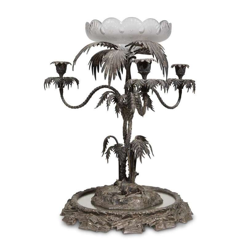In the form of a palm tree, surmounted by cut-glass bowl and raised on mirrored plateau; unmarked.