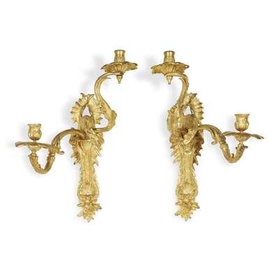 The backplates each in the form of a dragon with splayed wings issuing two scrolling foliate candlearms, one applied with lizard; the nozzles and bobeches replaced. (2).