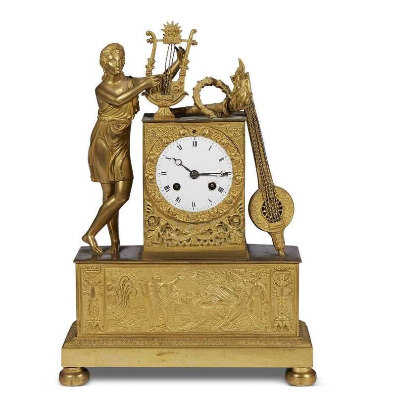 An Empire ormolu figural mantel clock depicting Euterpe apparently unsigned, early 19th century