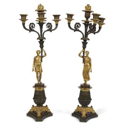 A pair of Louis Philippe ormolu and patinated bronze figural three-light candelabra circa 1830-40