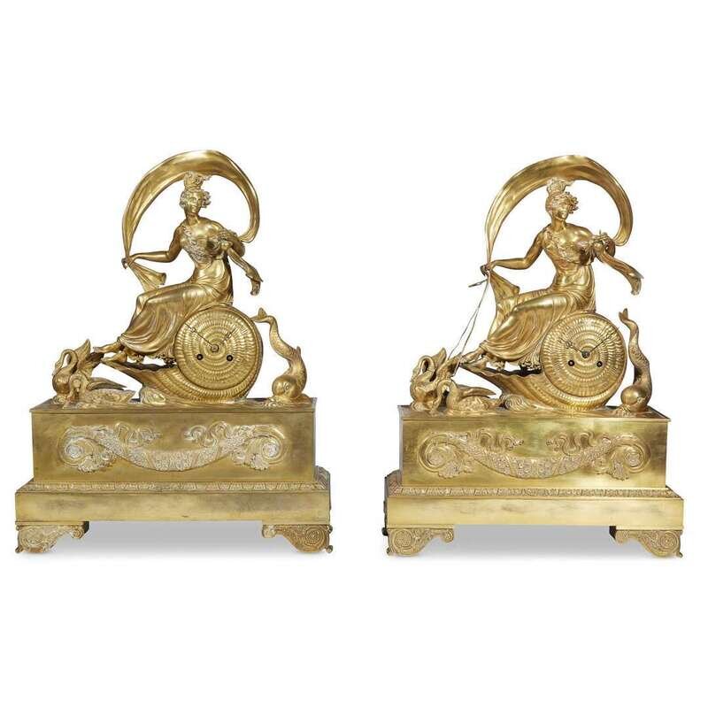 A pair of Napoleon III gilt-bronze figural mantel clocks depicting Venus Vittoz à Paris, mid 19th century