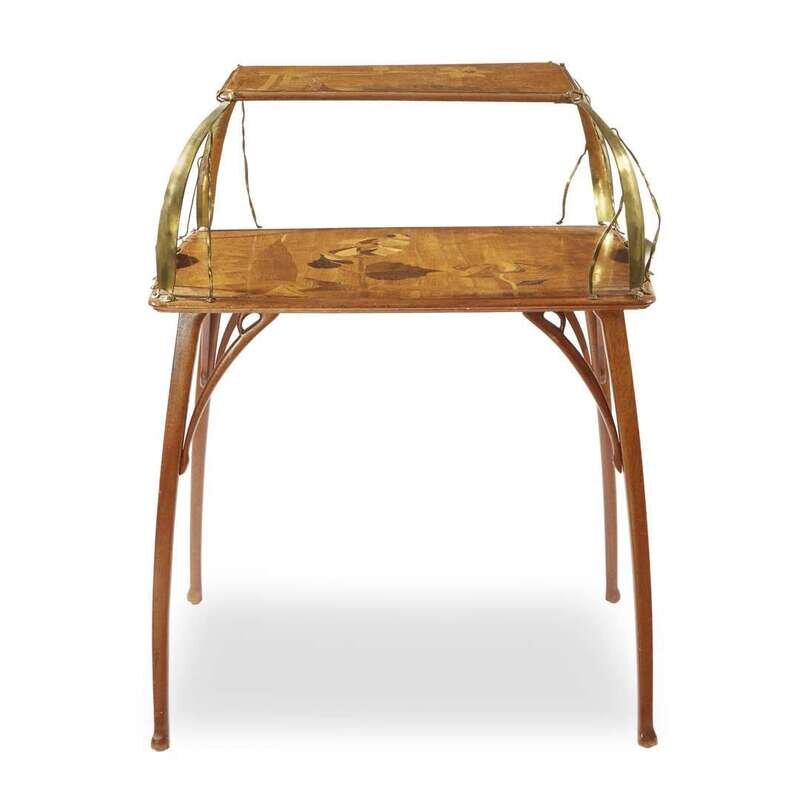 A Belgian Art Nouveau brass-mounted fuitwood inlaid amaranth two-tier tea table Gustave Surrurier-Bovy (Beligian, 1858-1910), circa 1900