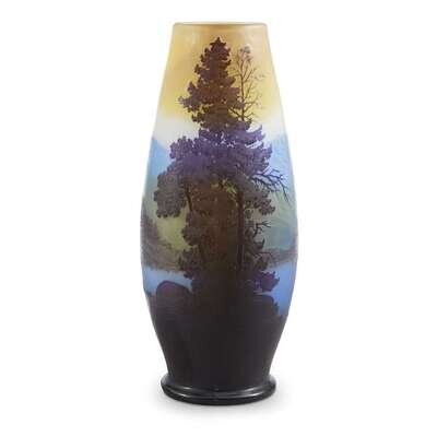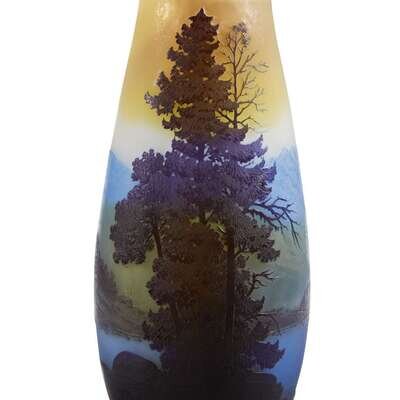 A tall acid-etched glass vase with mountanous landscape Galle, France, circa 1900