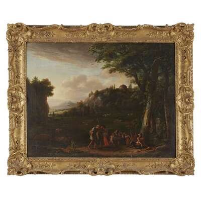 DUTCH SCHOOL-ITALIANATE (17TH-18TH CENTURY CENTURY) ARCADIAN LANDSCPE WITH FIGURES APPROACHING A SATYR