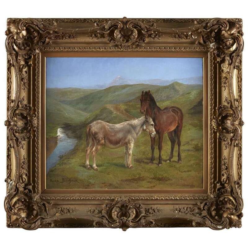 ROSA BONHEUR (FRENCH 1822-1899) A PONY AND A DONKEY IN A HILLY LANDSCAPE