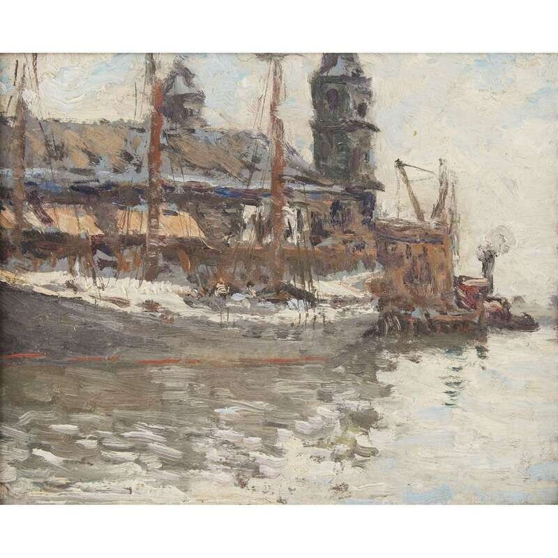 FRED WAGNER (AMERICAN 1861–1940) "SCHOONER DOCKED ON THE DELAWARE"