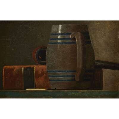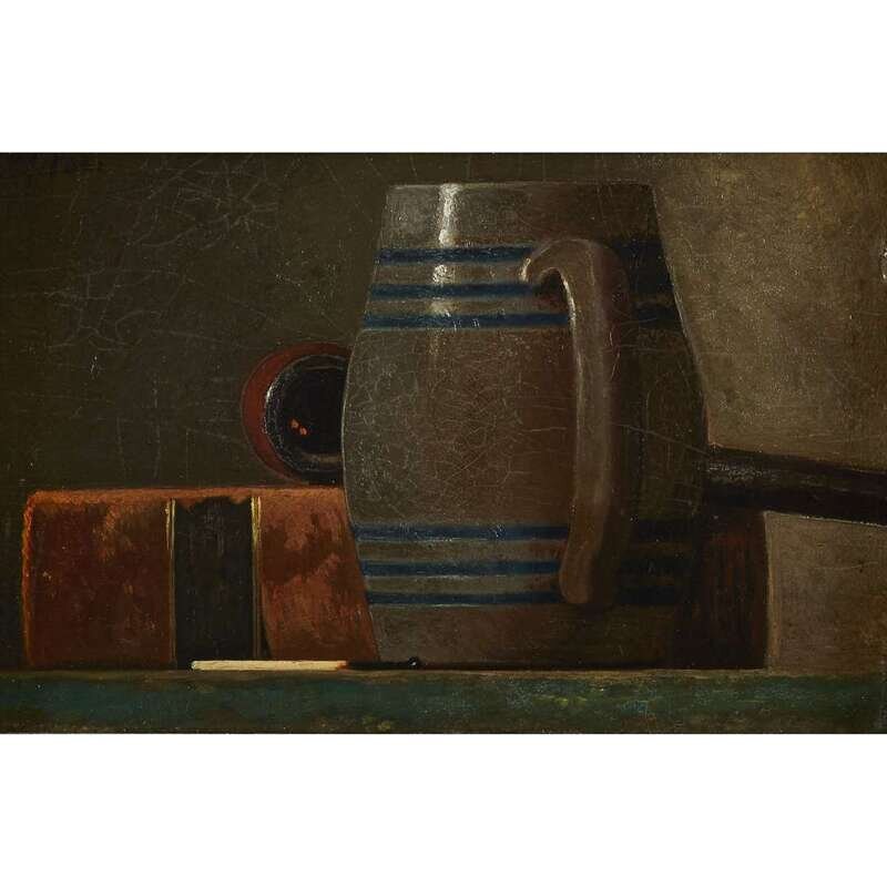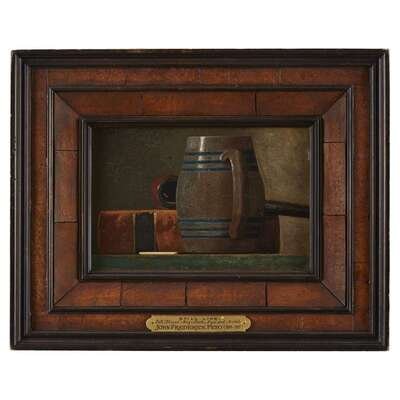 JOHN FREDERICK PETO (AMERICAN 1854–1907) "STILL-LIFE WITH SALT-GLAZED MUG, BOOK, PIPE AND MATCH"
