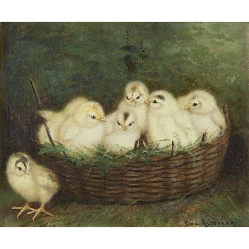BEN AUSTRIAN (AMERICAN 1870-1921) SEVEN YELLOW CHICKS IN A ROUND BASKET
