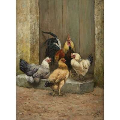 WILLIAM BAPTISTE BAIRD (AMERICAN 1847–1899) COCK AND HENS IN A FARMYARD