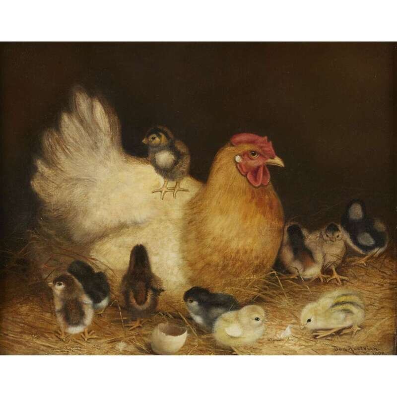 BEN AUSTRIAN (AMERICAN 1870–1921) TAN MOTHER HEN WITH TEN CHICKS