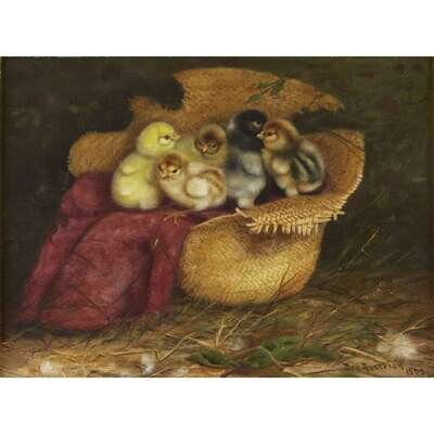 BEN AUSTRIAN (AMERICAN 1870-1921) FIVE CHICKS IN A STRAW HAT