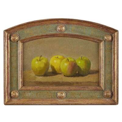 ROBERT KULICKE (AMERICAN 1924–2007) "TWO YELLOW AND TWO GREEN APPLES ON A LIGHT GREY-TAN BACKGROUND"