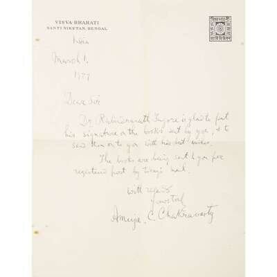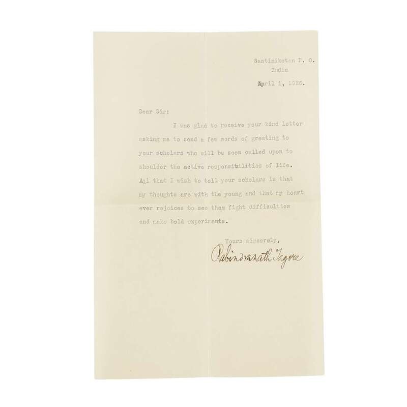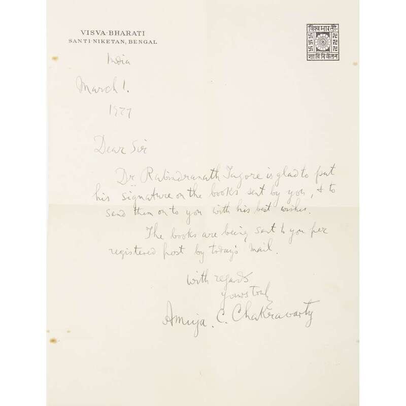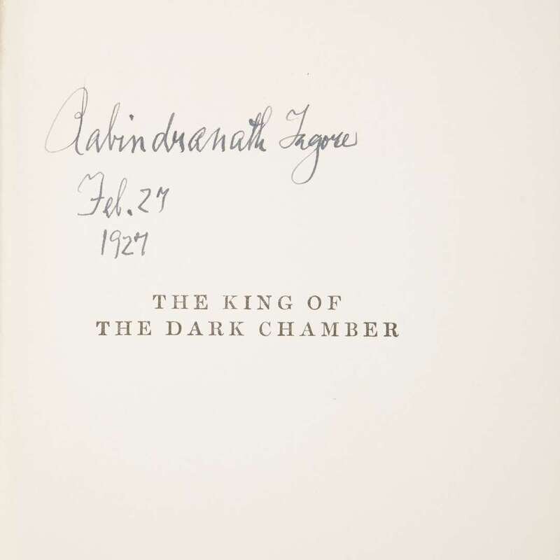 New York: The Macmillan Company, 1915. Third printing. 12mo. Signed and dated (Feb. 27/1927) by Tagore on half-title. With a T.L.s. by Tagore signed Santiniketan, India, April 1, 1926; in typed addressed postal envelope. Also included, an autograph letter signed by Amija C. Chakravarty to S.D. green, "Dr. Rabindranath is glad to put his signature on the books sent by you, & to send them to you with his best wishes…" dated March 1, 1927; in signed postal envelope. Original grey cloth, decorated and stamped in blind; lettered in gilt. Covers lightly worn; letters and envelopes lightly toned and foxed.