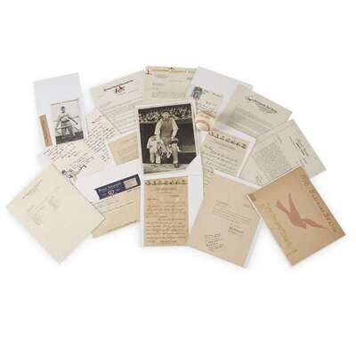 Small window into minor leaguer Joe Atton including 10 letters, most with envelopes, including a 1936 T.L.s. from former minor leaguer, Jeff Holmquist (1910-1917), addressed to Mickey Cochrane, asking Cochrane if Atton could "work out with you a day or so"; 2 photographs of Atton; 1 Official Pacific Coast League baseball signed by Atton; 1 handmade piece of ephemera; 1 Spring Training mimeographed note from Dr. H. Weaver, trainer for the St. Louis Cardinals; 1 telegram: "Have been released. Will be home 6:45 PM Saturday. Joe."
