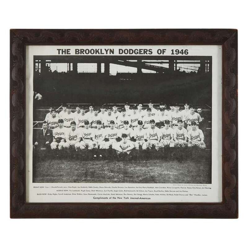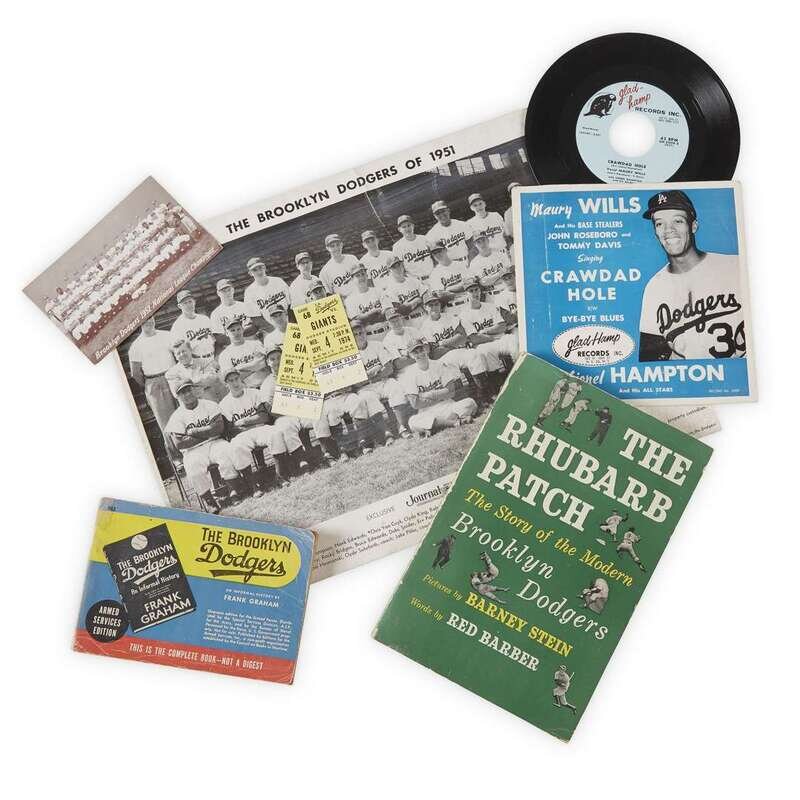 Includes: 1. 1945 Armed Services edition of The Brooklyn Dodgers by Frank Graham 2. 1946 team photo from the New York Journal-American, approximately 15 ½ x 19 ½ inches (sight), framed 3. 1951 team photo from the New York Journal American, approximately 11 ¾ x 16 ½ inches (some edges cut unevenly) 4. 1952 team photo postcard 5. 1954 first edition of The Rhubarb Patch: The Story of the Modern Brooklyn Dodgers by Red Barber and Barney Stein, stiff illustrated wrappers 6. 1962 45 RPM picture sleeve single of Maury Wills and His Base Stealers singing "Crawdad Hole" with Lionel Hampton and His All Stars 7. 1974 pair of Dodger Stadium ticket stubs for Dodgers/Giants game Condition varies. .