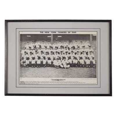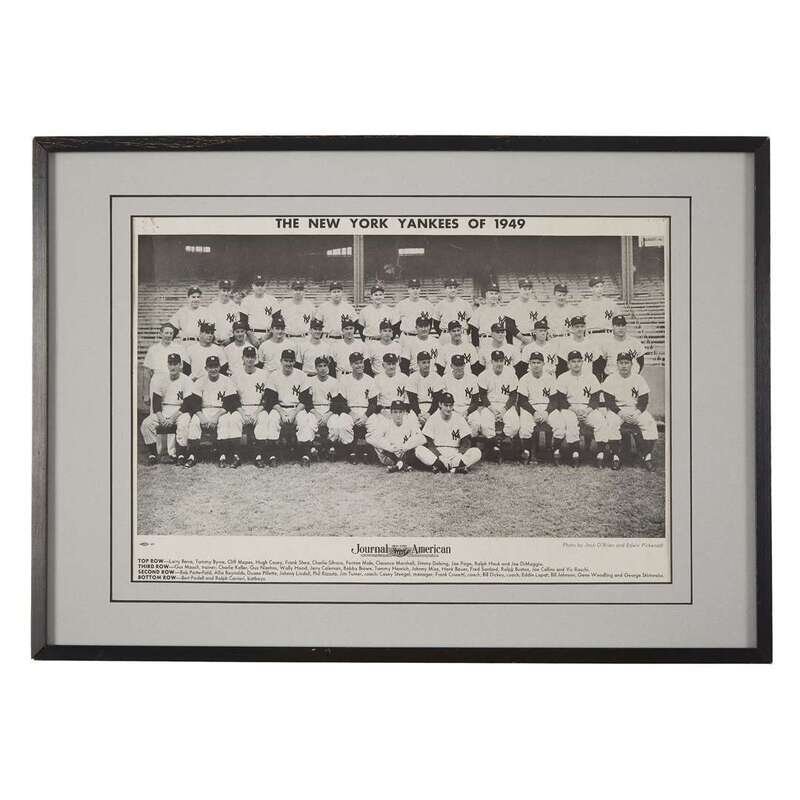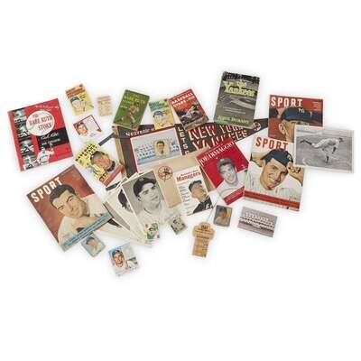 Includes: 1. 1941 Charlie Keller Play Ball baseball card, #21 2. 1941 (or 1942) Bill Dickey Play Ball baseball card, #70 3. 1941 (or 1942) Lefty Gomez Play Ball baseball card, #72 4. 1947 (or 1948) collection of 25 player photos, 8 x 10 in., in original mailing envelope 5. 1948 Billy Johnson Bowman baseball card, #33 6. 1948 first edition of The Babe Ruth Story by Babe Ruth, stiff illustrated wrappers 7. 1948 first Pocket Book edition of The Babe Ruth Story, by Babe Ruth, stiff illustrated wrappers 8. 1949 team photo from the New York Journal American, approximately 11 ¼ x 16 ½ inches (sight), framed 9. 1949 (September) issue of Sport magazine with Joe DiMaggio on cover 10. 1950 (February) issue of Sport magazine with Tommy Henrich on cover 11. 1950 (April) issue of Sport magazine with Casey Stengel on cover 12. 1950 first edition of The Thrilling Story of Joe DiMaggio, by Gene Schoor, stiff illustrated wrappers 13. 1950 revised edition of The Yankees: A Pictorial History of Baseball's Greatest Club, by John Durant, green cloth in price-clipped dust-jacket 14. 1951 Phil Rizzuto Topps red back baseball card, #5 15. 1952 team photo postcard 16. 1953 Gene Woodling Red Man baseball card, #12 17. 1954 Gene Woodling Red Man All-Star baseball card, #15 18. 1957 World Series press pass 19. 1967 pennant 20. 1976 first edition of Great Hitters I've Known, by Mickey Mantle, Carvel Comics No. 4 21. 1976 first edition of Great Pitchers I've Known, by Whitey Ford, Carvel Comics No. 5 22. 1958 Ballantine Beer schedule 23. 1950 first Lion Books edition of Baseball Stars of 1950, edited by Bruce Jacobs, stiff illustrated wrappers, Yankees players on cover 24. 1957 first edition of Baseball Stars of 1957, by Bruce Jacobs, stiff illustrated wrappers, Mickey Mantle and Babe Ruth on cover 25. 1961 first edition of Baseball's Best Managers, by Harold Rosenthal, stiff illustrated wrappers, Casey Stengel on cover, Sport Magazine Library No. 4 26. Tommy Henrich autograph, date unknown 27. Monte Pearson photo, date unknown Condition varies. .