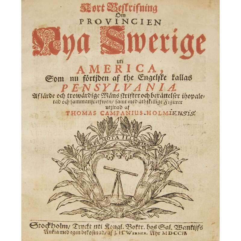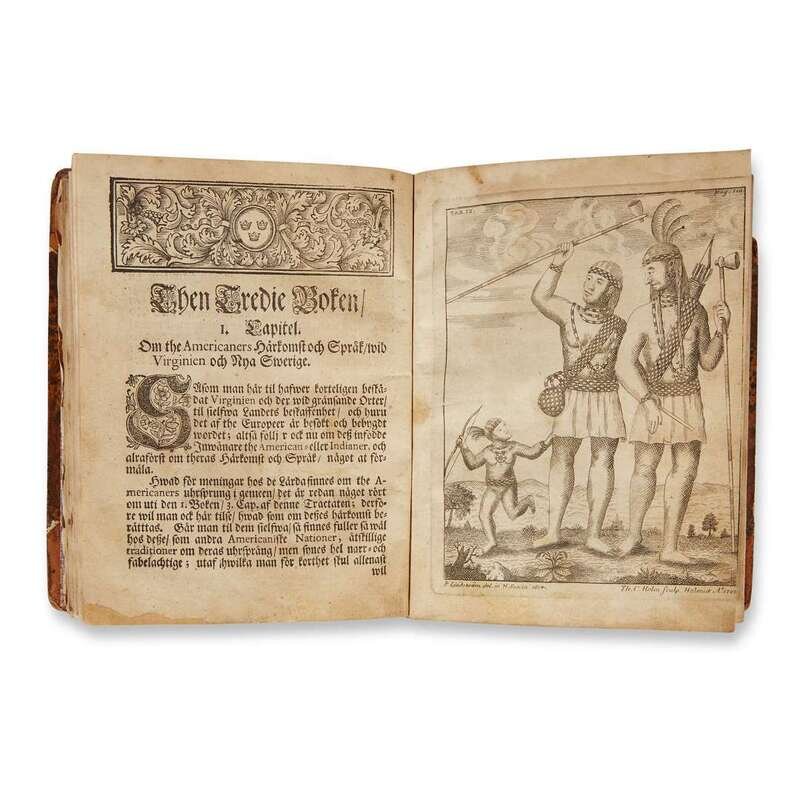Stockholm, 1702. First edition. 4to, 7 ¾ x 5 ¾ in. (186 x 146 mm). (16), (1)-190, [2] pp. Illustrated with an additional folding engraved title-page, two engraved plates and four engraved maps (with the folding map facing b4 recto supplied from another copy), and several woodcut illustrations of maps, plans, and views in text; engraved and letterpress titles loose. Title-page printed in red and black with woodcut printers device. Old sheep and tree calf, rubbed and worn, spine gone, front board detached along with endpaper. Dampstaining and repair to map of the Americas; dampstaining to Niagara view, with fore-edge likely repaired; American Indians plate trimmed at fore-edge with small losses to edge of image; dampstaining and repair to several leaves. Sabin 10202; Howes C 84; Church 803, Field 233; Sienert 125. First edition of the first detailed historic account of New Sweden in Delaware, Pennsylvania, and New Jersey. A guide to Indian vocabulary and phraseology is appended.