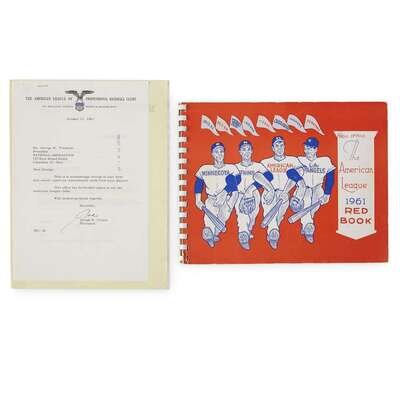 Includes: 1. Carbon of T.L.s. and addressed to Joe Cronin, President of the American League and Warren Giles, President of the National League, dated October 6, 1961 2. Mimeograph of T.L.s. by George M. Trautman, president of-and on letterhead of-The National Association of Professional Baseball Leagues and headed "Strictly Confidential," and saying in part, "payments made by the Major League organizations to first-year players in the first nine month periods of 1958, 1959, 1960, and 1961." Dated October 6, 1961 3. Two Mimeographed pages of figures regarding above 4. T.L.s. by Joe Cronin as president of the American League, October 11, 1961, all of the above stapled together 5. The American League 1961 Red Book, labeled "Farm Office" in ink on front cover, oblong 8vo, plastic spiral-bound. All in near-fine condition. .