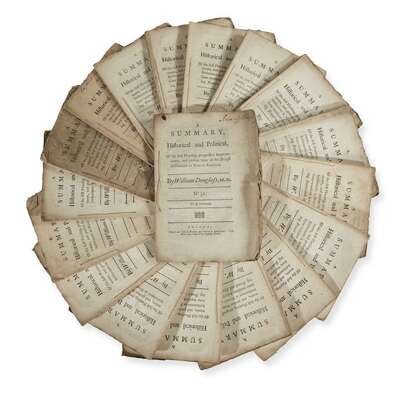 ... Spanish Settlements Boston: Rogers and Fowle, 1747-1748. In 19 volumes. First edition, parts issue. Including [volume I], numbers 1, 3, 5, 8, 9-13, 15-18, 20, 21, 24-26, 28, and 31. 8vo. Original sewn self-wrappers; untrimmed. Condition varies. The parts issue was published in two volumes of 36 and 26 parts. Howes D- 436, "First American History of the whole country; Evans 5936, 6126, see Evans 6306 & 6307.