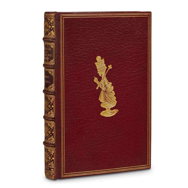 London: Macmillan, 1872 [1871]. First edition, first issue. Illustrated by John Tenniel. Small 8vo. Early or mid 20th century crushed maroon morocco; richly stamped in gilt with gilt figure of the red queen at the center of the front cover; inner dentelles gilt; all edges gilt; marbled endpapers; original cloth covers and spine bound; by Riviere & Son. Illustrated with frontispiece and tissue guard with illustrations in text. With "wade" on p.21. Williams 21.