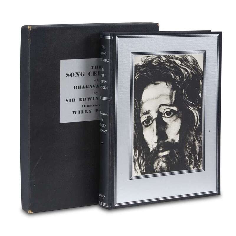 Browning, Elizabeth Barrett Sonnets from the Portuguese New York: Thomas Y. Crowell Company, [1936]. Gift edition. 4to. 96 pp. Mounted color frontispiece plus seven mounted color plates. White dust-jacket and red cloth, lettered in gilt, top edge gilt, others rough trimmed; with original red and white box. Box worn and faded, dust-jacket toned and lightly soiled; partly unopened. Arnold, Sir Edwin (translator) The Song Celestial or Bhagavad Gita Philadelphia: David McKay Company, [1934]. Gift edition. 4to. 135 pp. Frontispiece plus 17 plates. Illustrated blue and silver cloth; with original blue and silver gift box. An attractive and bright copy. .