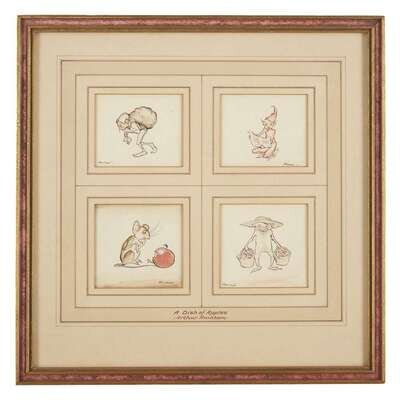 Four small ink and watercolor drawings Each 3 x 3 in. (76 x 76 mm) (sight); signed "Arthur Rackham" in bottom corners. Framed together.