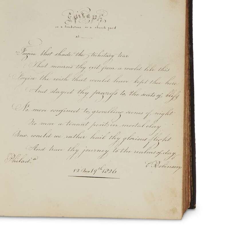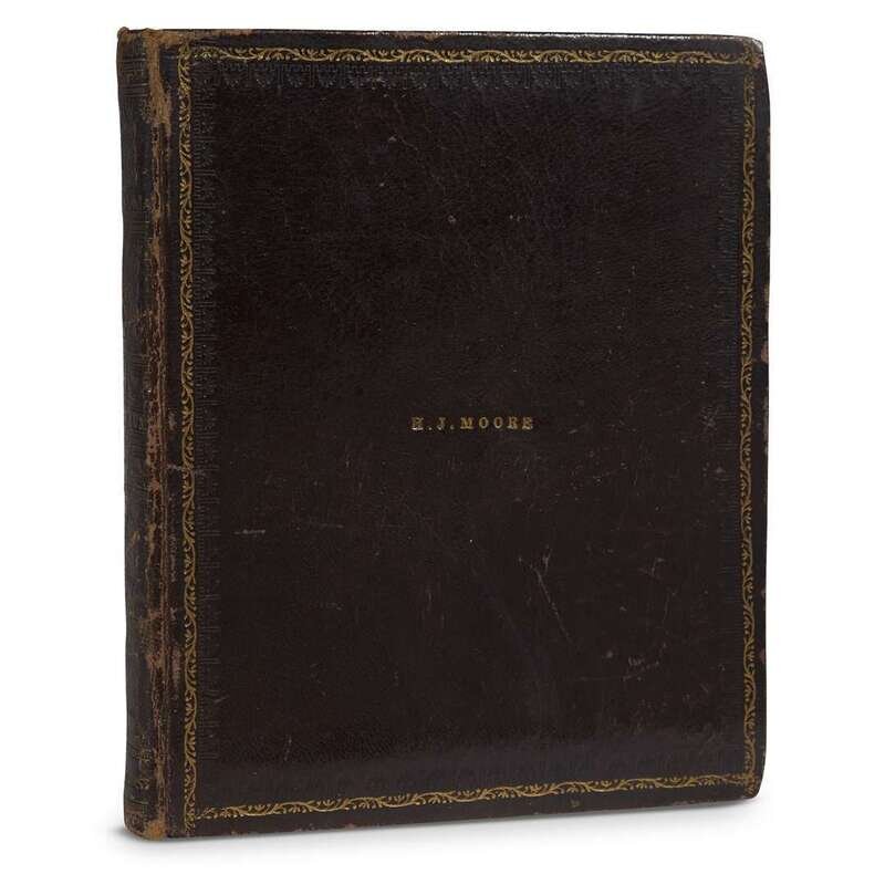[Philadelphia], 1826-1830. Small 4to. Inscribed by H(annah) J. Moore, with approximately 50 leaves of manuscript entries. Original gilt paneled purple-brown morocco, joints and extremities slightly rubbed; edges stained deep pink; dampstaining to bottom margins.