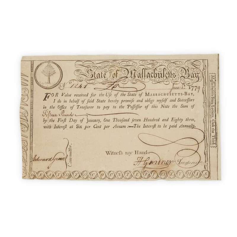 June 1, 1779. 5 ¾ x 8 in., (145 x 228mm). Signed by Treasurer H. Gardner, "Pay to the possessor of this note the Sum of Fifteen Pounds by the First Day of January, One Thousand seven hundred and Eighty three." Printed document with filled in manuscript, minor wear, apparently uncancelled. The engraving has been erroneously attributed to Paul Revere. [Anderson MA-15].