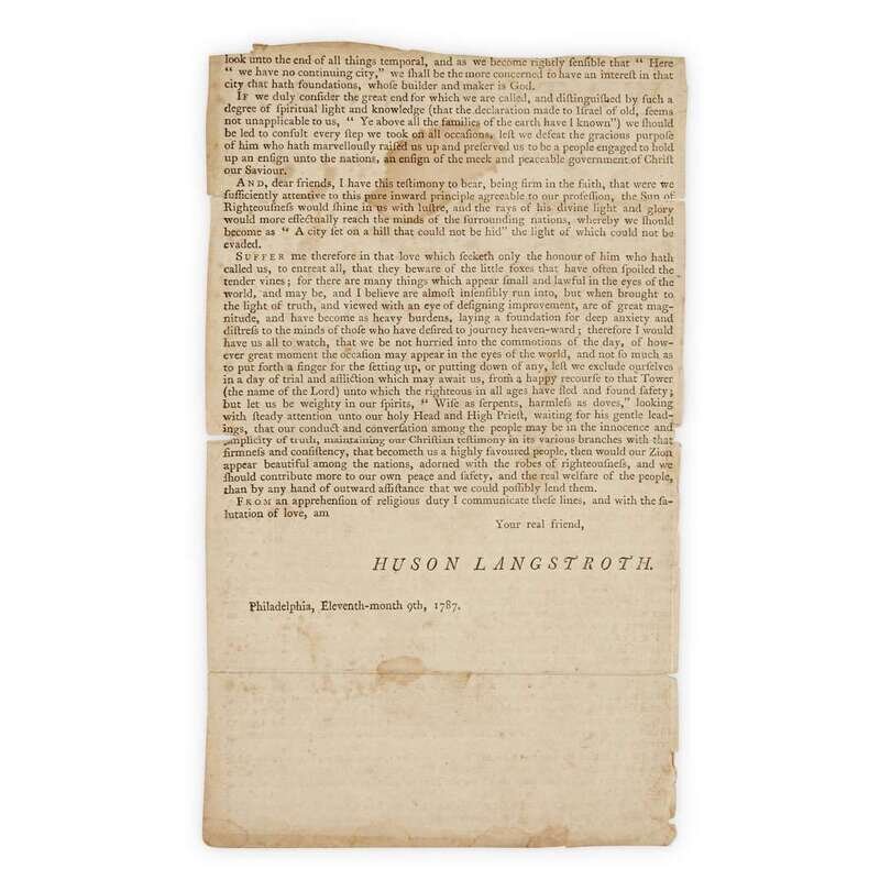 Printed “Broadside.” Philadelphia, (November) 9, 1787. 1 folio sheet, 11 x 7 in. (303x182mm). 2pp. Moderately toned; creasing and small separations along old folds; small dampstaining; small paper losses at edges, but with negligible losses to printing. Evans 20449; Smith, Friends Books p.83.