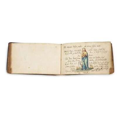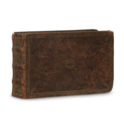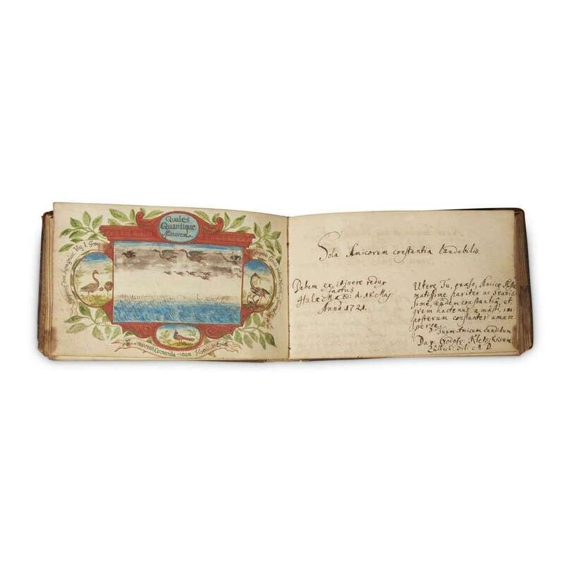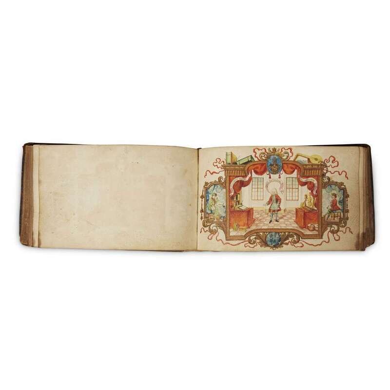 Germany, ca., 1720. 12mo; 4 x 6 ½ in. (102 x 167mm). Illustrated with four full page watercolors, including armorial features, and one watercolor embellishing a manuscript entry; approximately 27 manuscript entries, most in Latin and at least one in German, with several entries dated 1716, 1718, and 1722; several blank leaves. Contemporary brown calf, scuffed, extremities rubbed; stamped in gilt; all edges gilt; scattered soiling in margins.