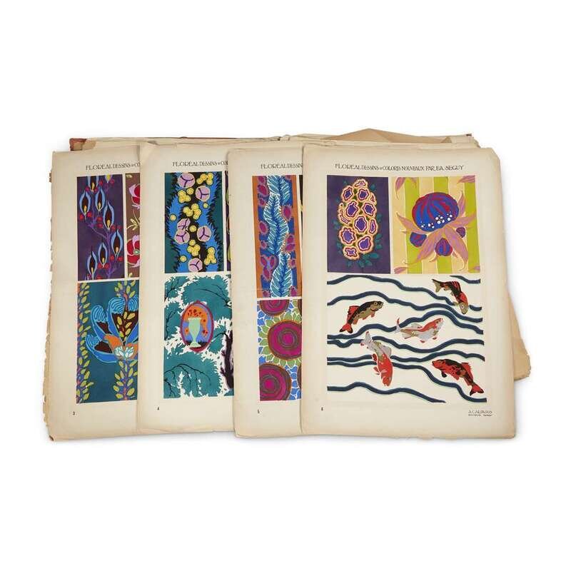 Paris: A. Calavas, [ca. 1925]. Folio. Illustrated with title-leaf and 20 color pochoir plates, loose as issued, with several tissue guards remaining, some creasing and chipping to plate edge. Publisher’s cream cloth and red board portfolio, worn, frayed and darkening; printed red cover label; silk ties.