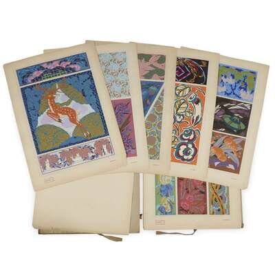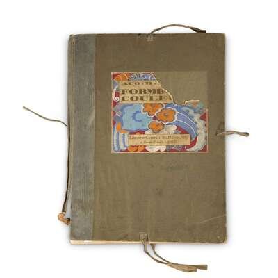 Paris: Albert Levy, [1921]. Folio. Illustrated with title-leaf, 67 color pochoir designs on 20 plates, loose as issued, toned, some edges chipped. Publisher’s gray cloth and olive paper board portfolio, covers detached and affected by damp; cover pochoir label, loss to top corner; silk ties.