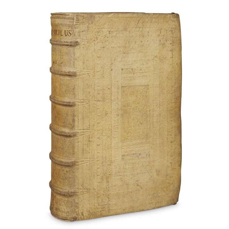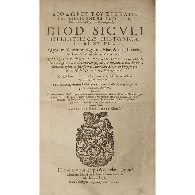 Hanoviae (Hanau): Wechelianis apud Claudium Marnium & haeredes Joannis Aubrii, 1604. Two volumes in one, each with a separate title-page. Folio. (32), 1-362, 63; (12), 1-1013, (1)pp. Greek and Latin text in parallel columns. With printer's device on each title-page and the blank verso of the last text leaf; apparently missing the colophon leaf. Contemporary pigskin, corners bumped, moderately scuffed; tooled in blind with pictorial central panels. The surviving 15 books (I-V, XI-XX) of the first century BC Greek Historian's immense Library of World History in 40 books. The last complete copy vanished in the sack of Constantinople in 1453. .