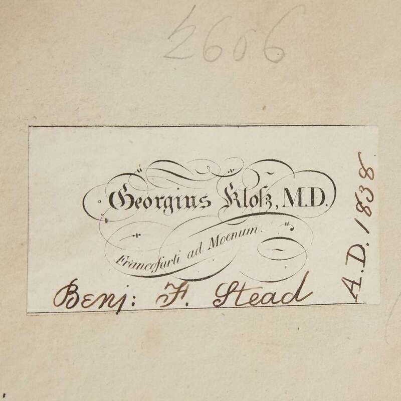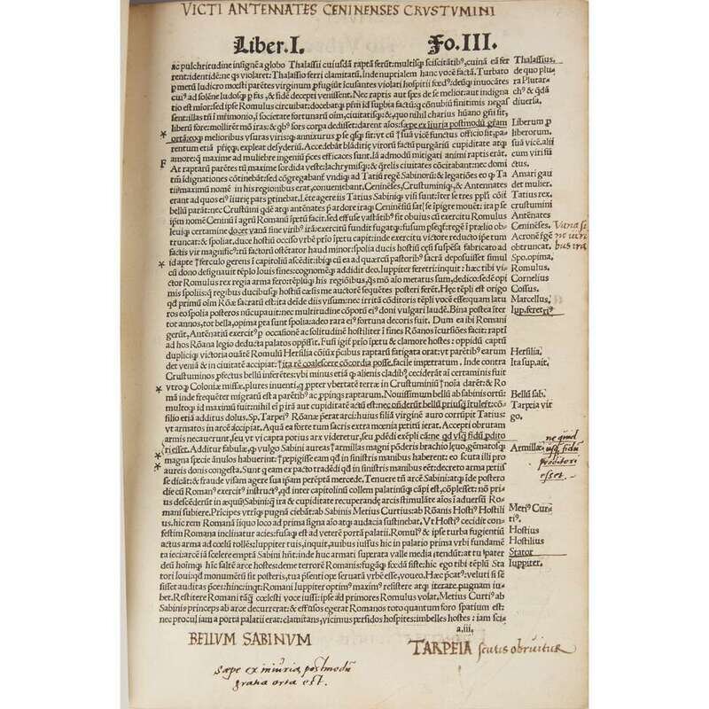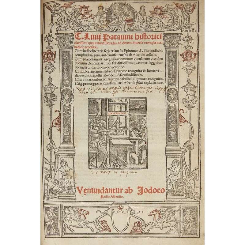 ... uersa exempla acri iudicio reposutae... (Paris): Venundantur ab Jodoco Badio Ascensio, (1516). Folio. [40], CCLXXX leaves; pi8, aa-dd8, a-z8, A-M8, colophon on M8. Title-page in red and black with printer’s device, decorative border partly colored in red, and woodcut initials. With an old ink Latin annotation on the front free endpaper recto, “Hic liber olin Melanchthonis fuit ” (This book once belonged to [Philip] Melanchthon). From the library of Georg Kloss M.D. and with his book-plate on front paste-down (Georgius Klosz), and with the later ownership signature of Benj(amin). F. Stead, dated 1838, on same. Old annotations on title-page; numerous manuscript interlineations and marginal notation throughout entire volume [see below for the attribution of these to Melanchthon]. Old three-quarter vellum over marbled boards (ca. 1700), covers and corners heavily worn, vellum spine starting; edges stained red; small worm holes, slightly affecting a few words; scattered minor soiling and foxing; occasional light creasing; top corner of front free endpaper excised. OCLC 38712280; not recorded by USTC or Adams. Georg (Franz Burkhard) Kloss’ library was sold at auction by Sotheby and Son in 1835. The Catalogue of the Library of Dr. Kloss, of Frankfort…including many original and unpublished manuscripts, and printed books with MS. annotations, by Philip Melancthon… described the above volume, lot 2606, as “Melanchthon’s copy, with numerous interlineations and marginal notes.” Provenance: by familial descent from Benjamin Stead. .