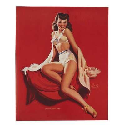 Gil Elvgren is known for his work for Brown & Bigelow, a publisher of promotional calendars and other materials. Previously, he worked for the Lois F. Dow Co., painting pin-ups for calendars. In excellent condition, with a faint crease in middle of sheet, where it was folded.