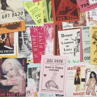 A remarkable collection of approximately 1,070 tart cards (including some duplicates). 1980s–90s. Most are the size of an A6 postcard (6 x 4 in. (15.2 x 10.2cm)) and a few measure approximately 3 3/4 x 4 in. (9.5 x 10.2cm). All are in excellent condition, with the exception of one that was adhered to the back of another, resulting in some surface damage. Some with handwritten phone numbers or additions to illustrations in marker. London sex workers used tart cards to advertise their services in the city’s ubiquitous red phone boxes, which functioned as free advertising space—and encouraged clients to call immediately. They provide an exhaustive catalogue not only of sexual preferences, but also of typography and printing methods from the 1980s through the advent of the personal computer. After street solicitation became illegal in the U.K. in 1956, sex workers began placing printed advertisements in shop windows. They began using tart cards in 1984, when the 1953 Post Office Act was repealed, which had previously prohibited any advertisements inside phone boxes. Early tart cards started as discrete, business card-sized advertisements, but by 1992 the standard size increased to A6 postcards. As printing technology evolved and computers became more accessible, cards transformed from having simple, often appropriated fonts and imagery to featuring more elaborate photographic reproductions. Most were printed on an offset lithography press, and monochrome photographic images became common by 1994. The first four-color photographic cards were produced in 1992, but didn’t become the norm until 1998. Several institutions have extensive collections of tart cards, including the Wellcome Collection in London.