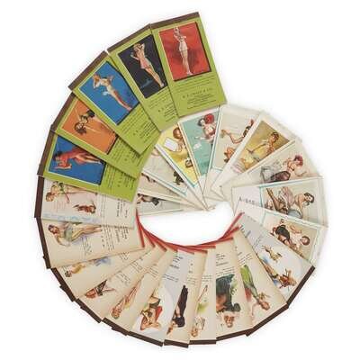 Promotional calendar notepads advertising S. R. Schlegel, George Herz & Co., R. E. Chase & Co., and Rock Wool Insulating Co. IIllustrations by Earl Moran and Gil Elvgren. All in excellent condition, with some very light soiling on some covers.