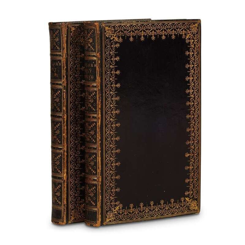 London: W. Pickering, 1844. In two volumes. Small 8vo. Illustrated with frontispiece portrait in the first volume. Contemporary full polished black calf; richly stamped in gilt; gauffered edges in gilt; inner dentelles gilt; marbled endpapers, joints rubbed and starting, covers and spines slightly scuffed. Some darkening at edges of front matter, gift inscription on front blank.